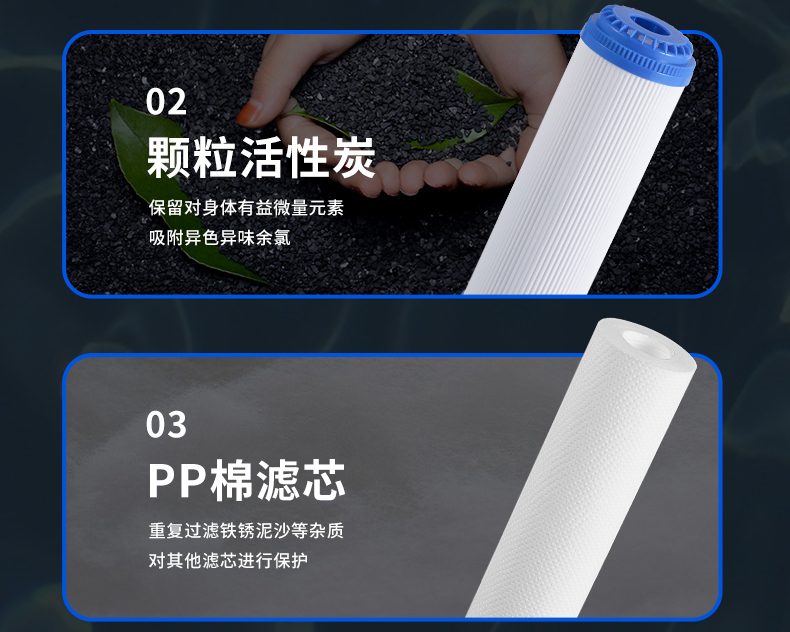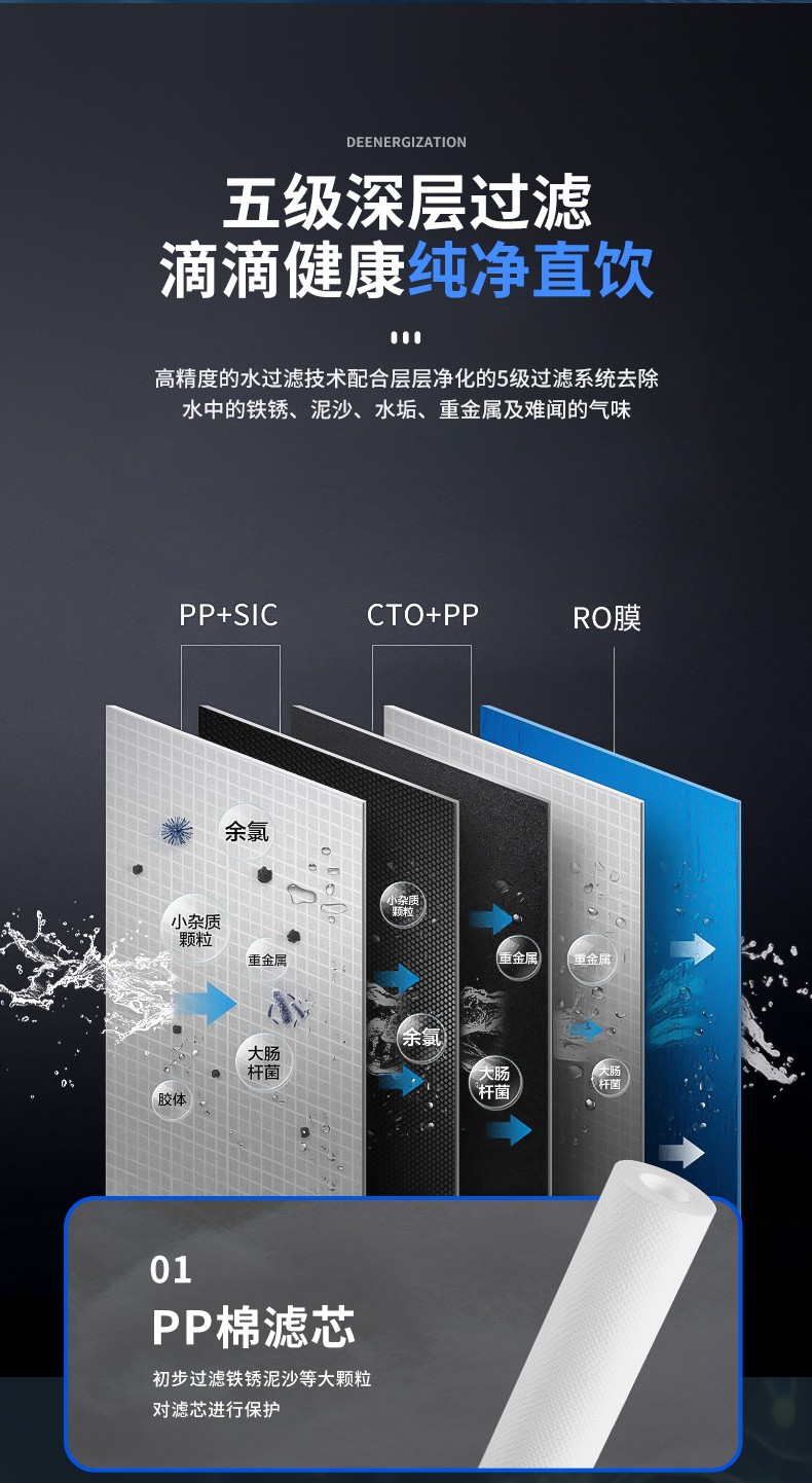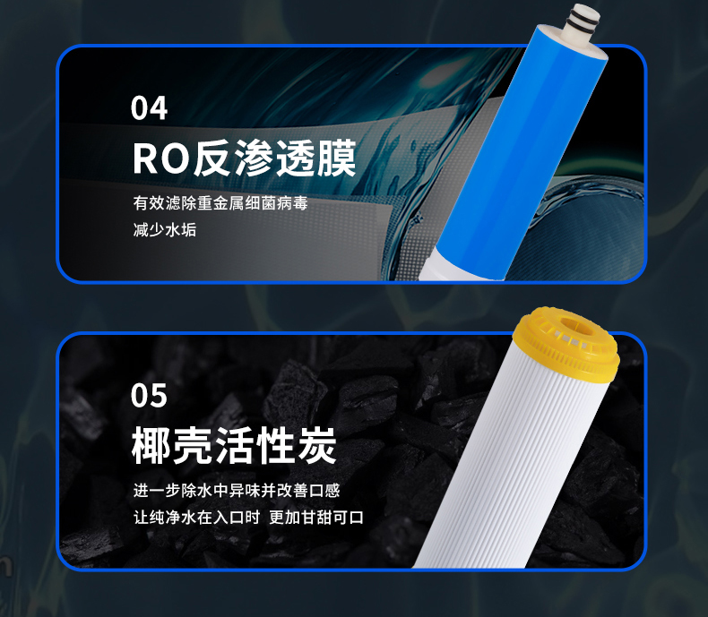 五级过滤,净享安全用水。PP棉能有限过滤水中微生物颗粒物铁锈泥沙等;反渗透RO膜0.0001微米过滤精度彻底过滤水中所含重金属、颗粒物和有机化合物等杂质;前置后置活性炭彻底吸附水中异色异味漂白粉、重金属等,改善口感,强效抑菌,水质清澈透明。